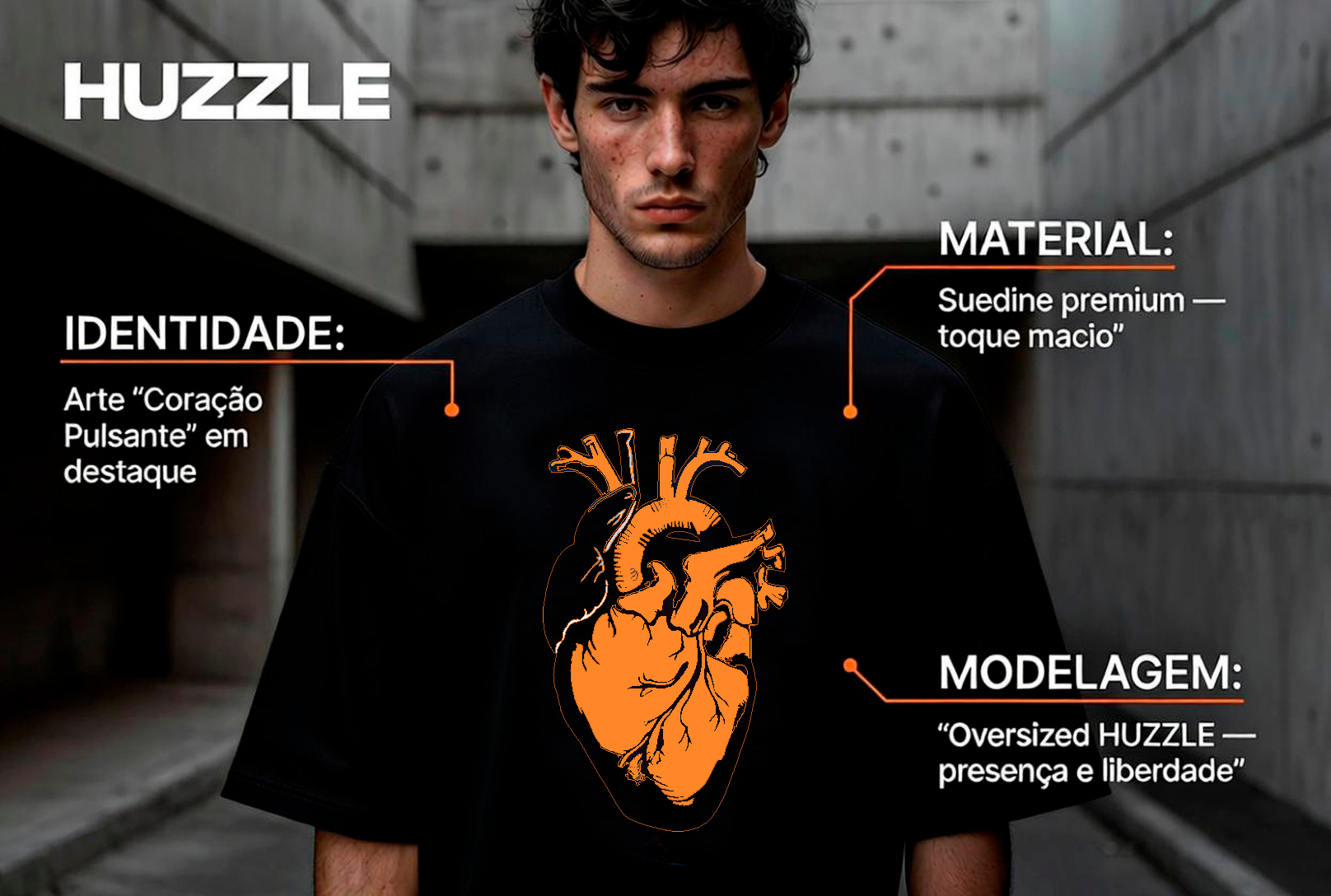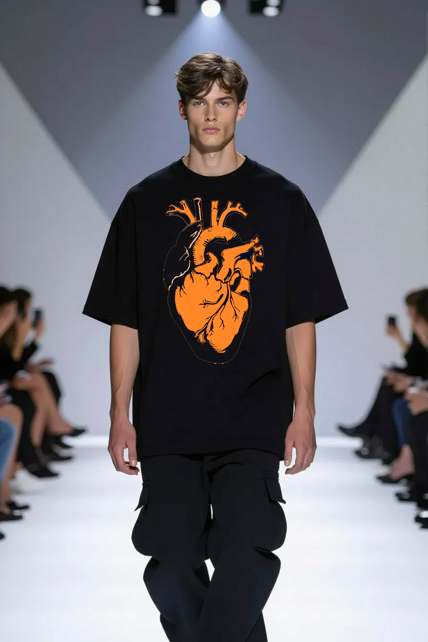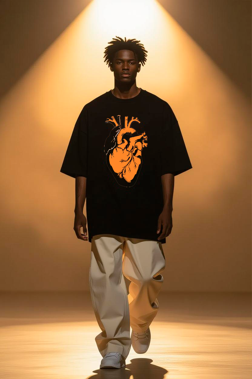 A HUZZLE Oversized Linha Manifesto não foi pensada para ser discreta. O coração anatômico em laranja HUZZLE acende o contraste certo para chamar o olhar e gravar a imagem na memória. Não é um desenho aleatório: é o símbolo do impulso, da força interna e da vida em movimento. Quem vê, sente antes de entender.