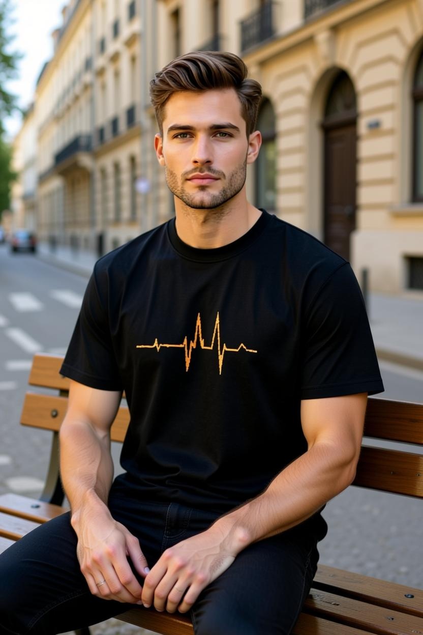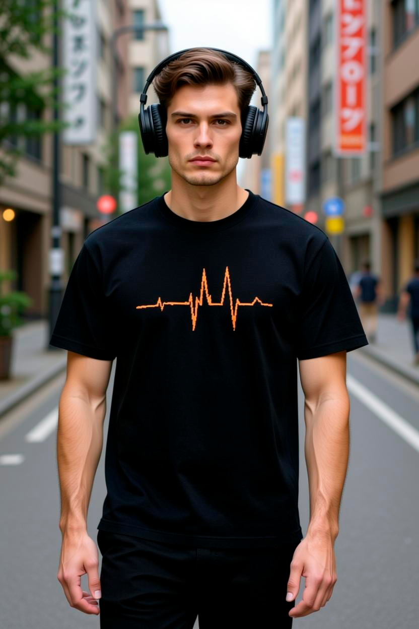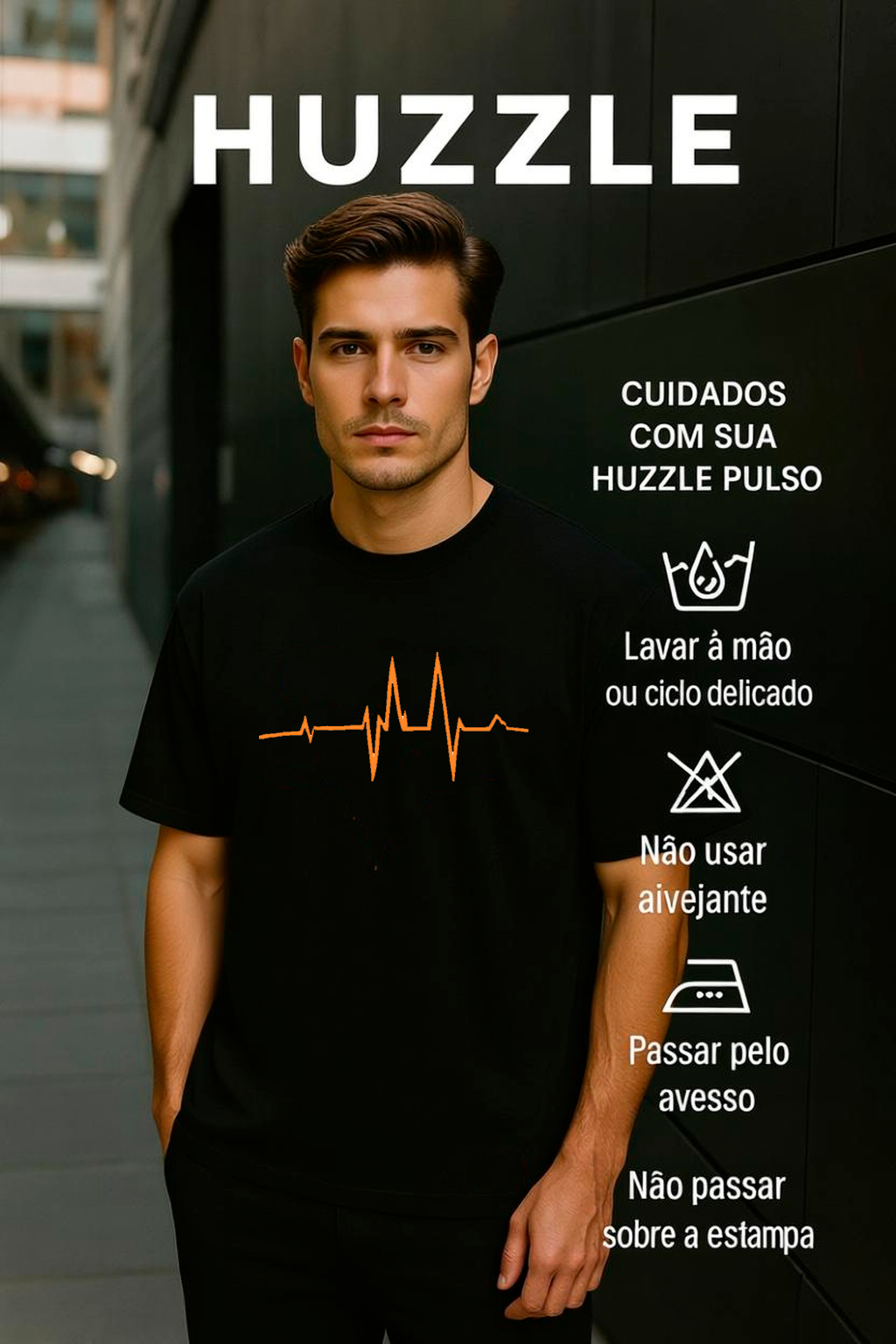 A HUZZLE PULSO carrega o símbolo vital que nos move: o batimento. A estampa frontal, em tom laranja intenso, pulsa como quem já passou por tudo e continua aqui. Nada grita. Mas tudo vibra.